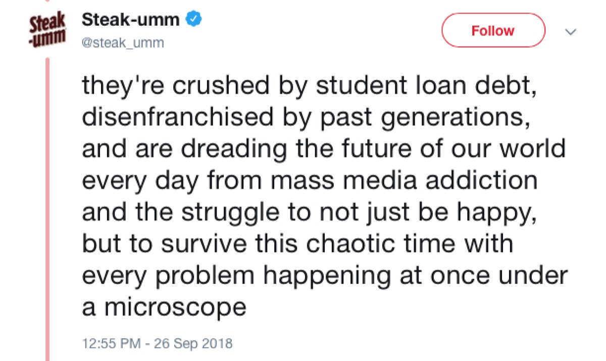 The social media account of a sliced meat product should be tweeting about, oh, we don’t know, maybe slice meat products? Instead, they’re pontificating about the disillusionment of modern teens. Young people are “crushed by student loan debt,” they tweeted, “disenfranchised by past generations, and are dreading the future of our world every day from mass media addiction and the struggle to not just be happy, but to survive this chaotic time.” That bit of wisdom comes from, again, Steak-umm.