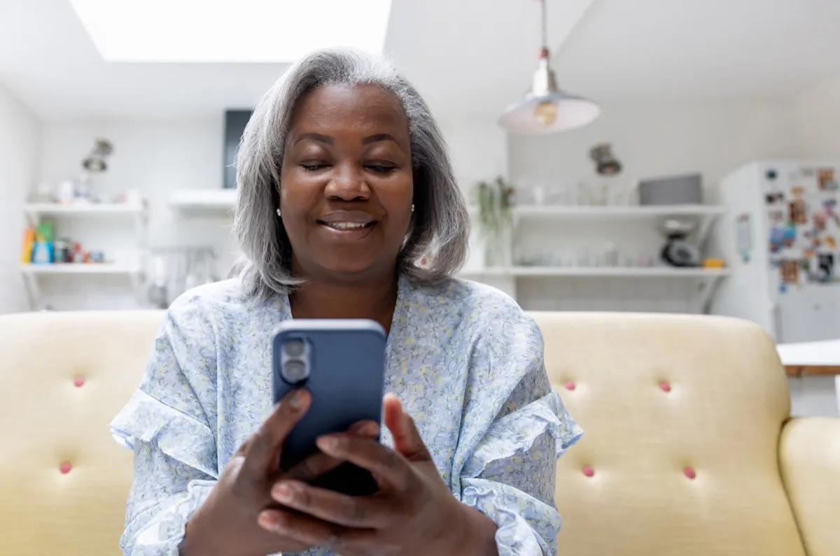 Happy mature woman at home looking at social media on her cell phone - lifestyle concepts