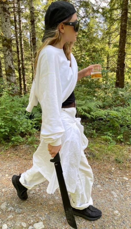 Ashley was recently photographed hiking in the woods with a drink and a machete in hand.
