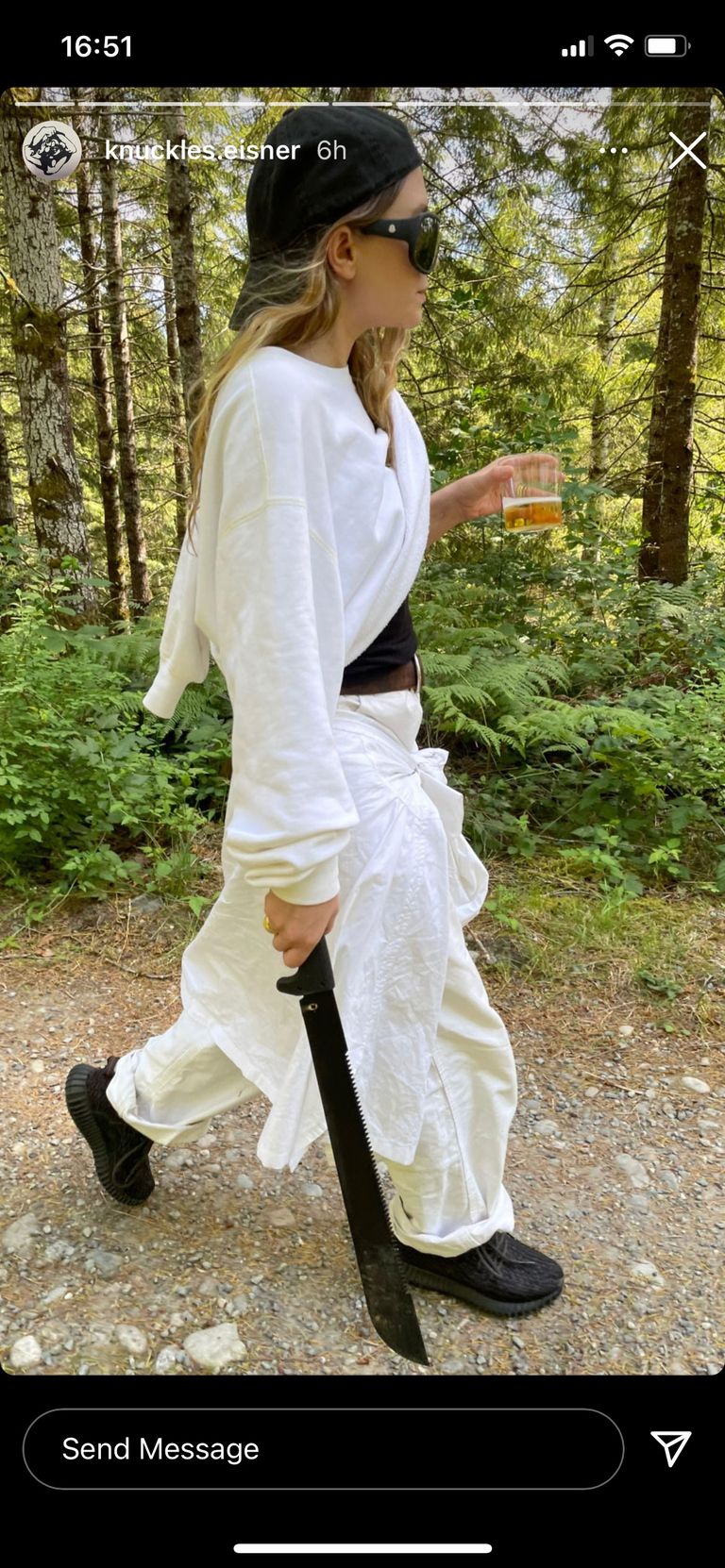 On Friday, Ashley Olsen’s longtime boyfriend, Louis Eisner, posted a photo of her to his Instagram Story clad in flowy white clothes and her trademark big sunglasses, while wielding a rather surprising accessory. She casually carried a drink in her left hand and a machete in her right.