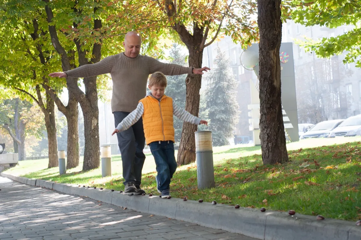Grandfather and his grandson playing in the park, doing a balance walk