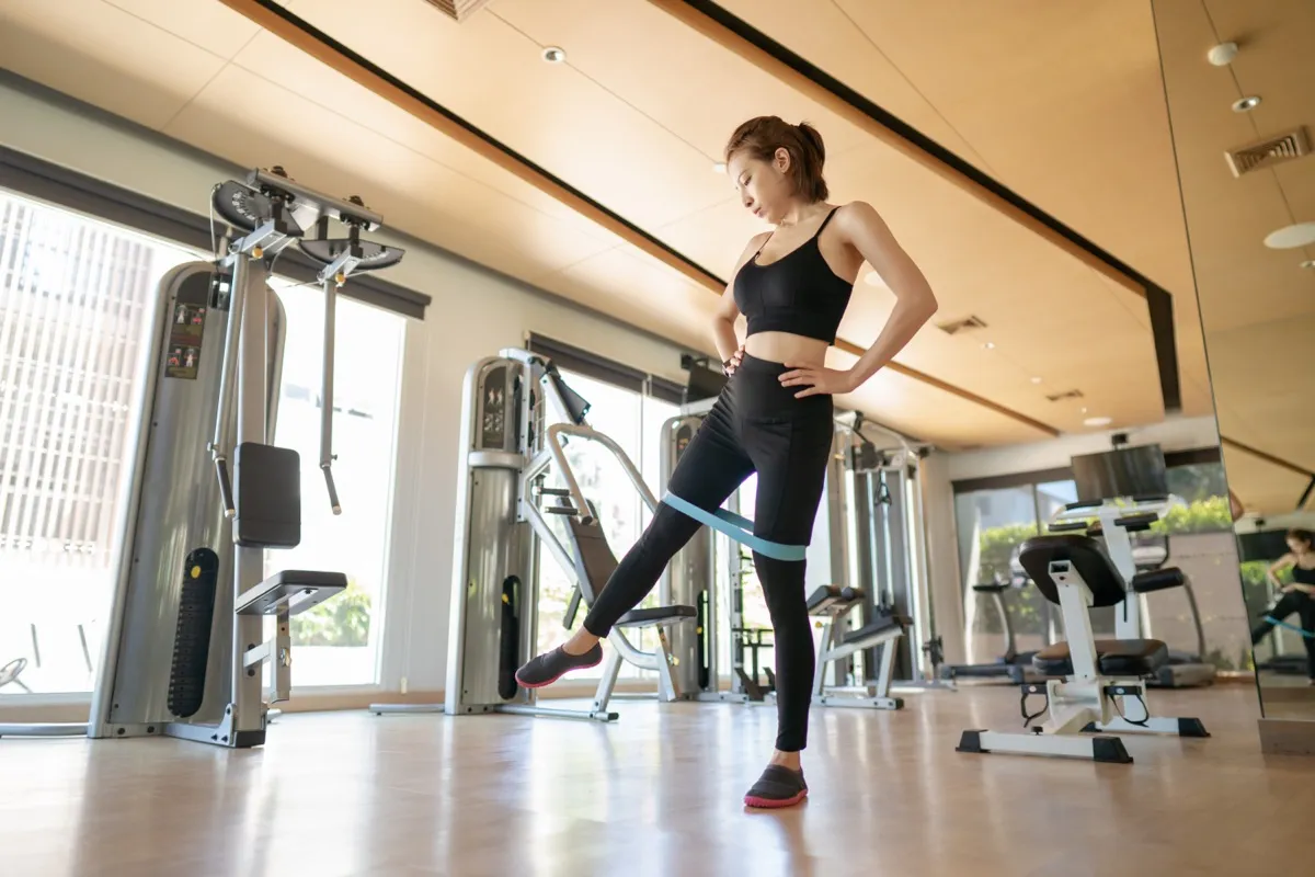 Woman training legs muscles, doing side leg raise with elastic band in gym