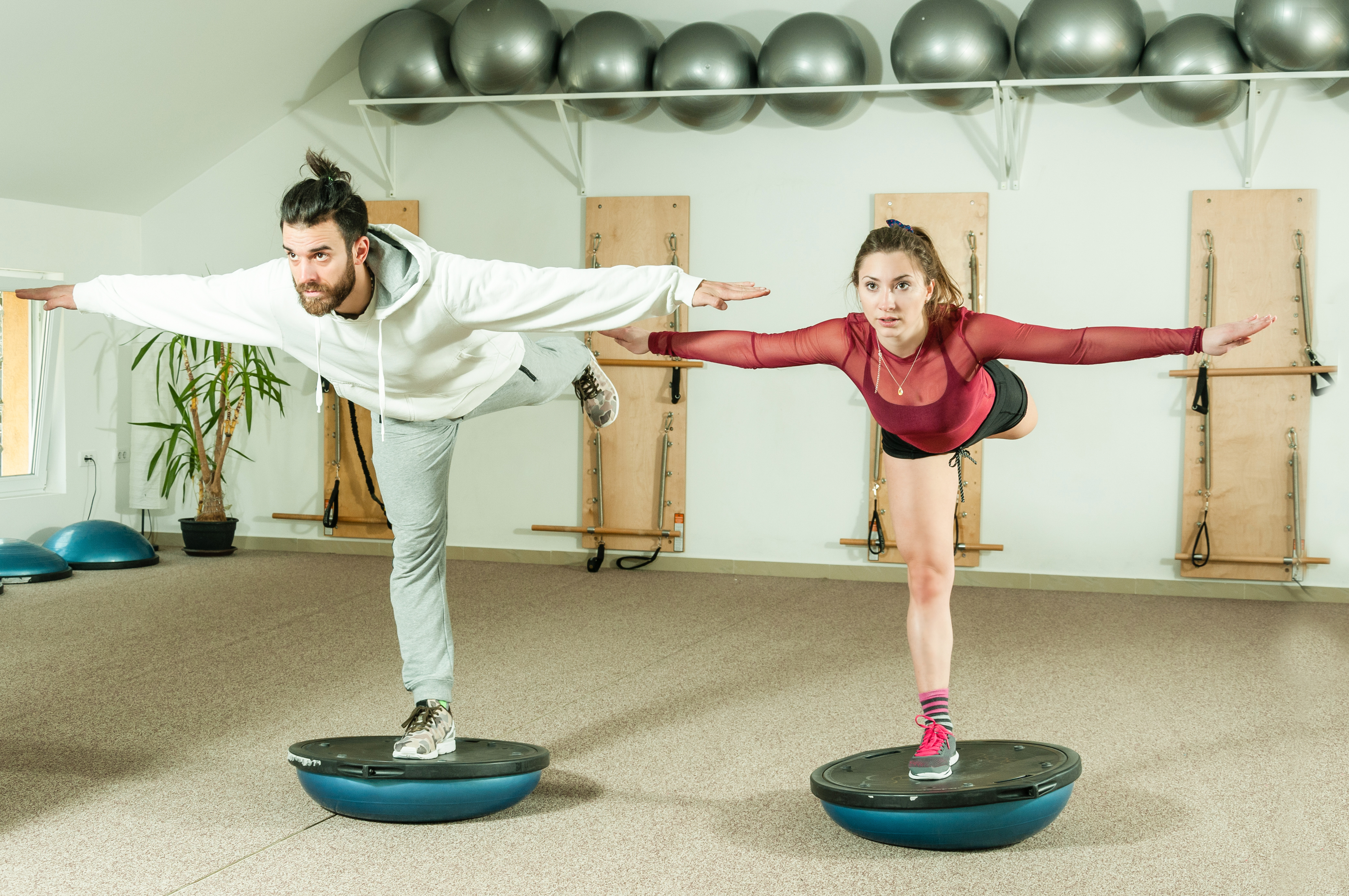 Young couple doing balance exercise on half ball