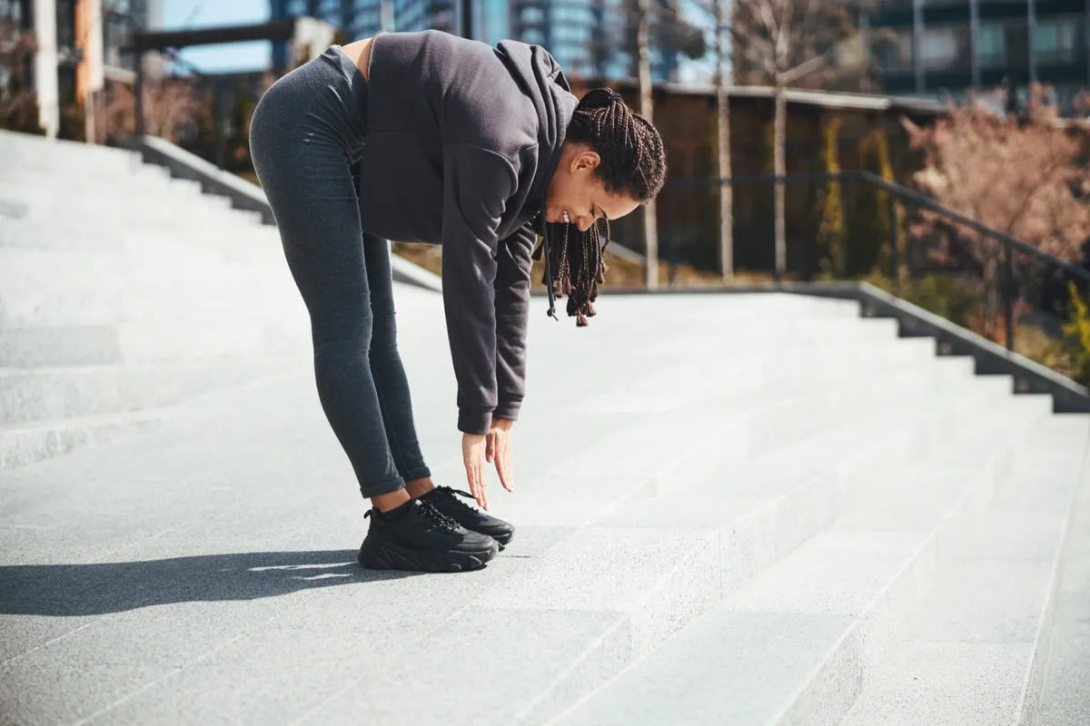Woman touching her toes to stretch before a run