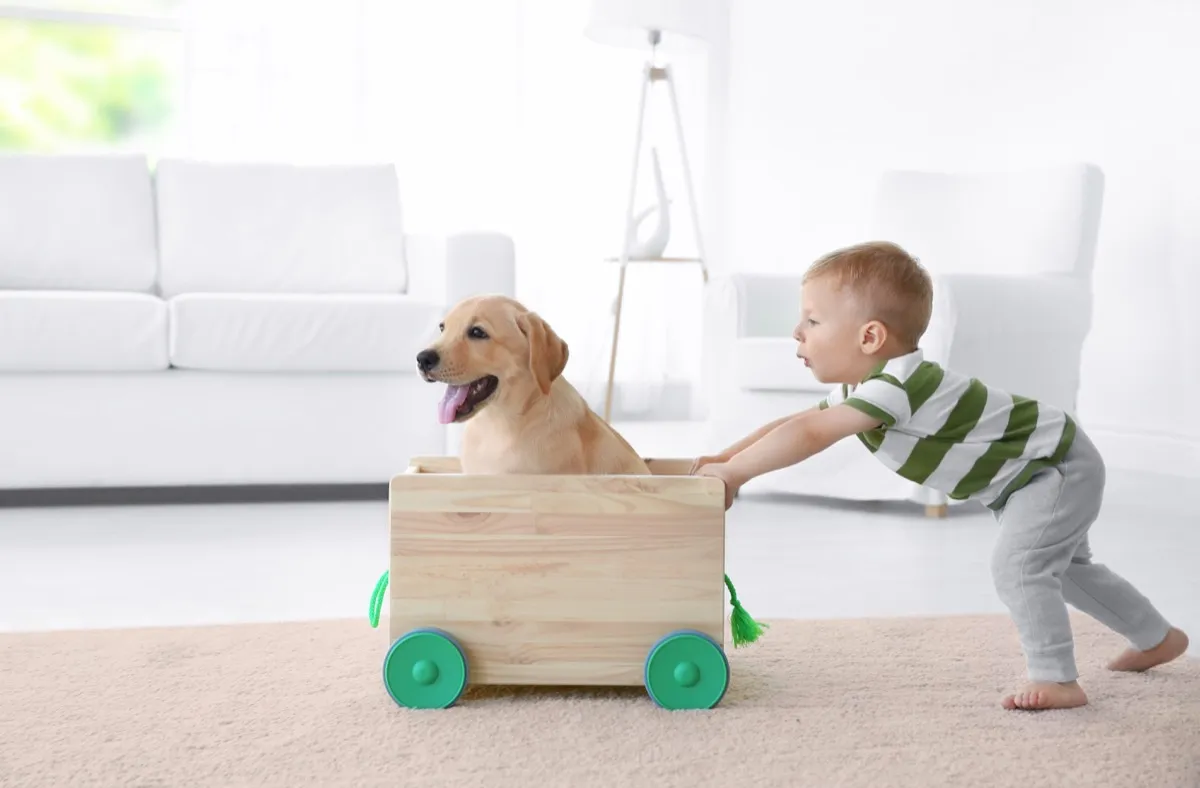 “Labs are some of the best dogs for families,” says veterinarian Sara Ochoa, veterinary consultant for DogLab. “These dogs are very playful and easy to train. They can be very active to run around all day with kids or curl up on the couch and watch a baby sleep.”