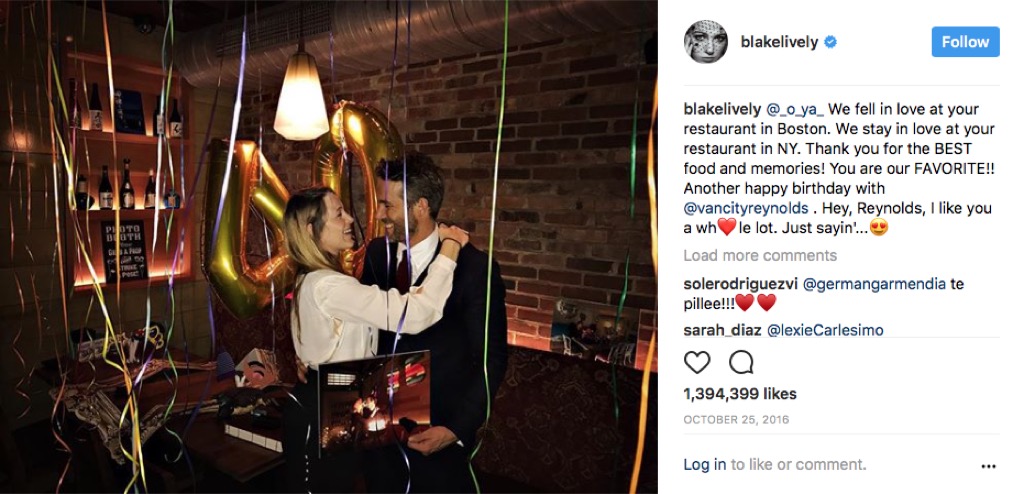 For Reynolds’ birthday last year, Lively threw him a party at the restaurant where they fell in love. It seems like remembering that day was and is very special to both of them. In an Instagram post Lively says: “@_o_ya_ We fell in love at your restaurant in Boston. We stay in love at your restaurant in NY. Thank you for the BEST food and memories! You are our FAVORITE!! Another happy birthday with @vancityreynolds. Hey, Reynolds, I like you a wh❤️le lot. Just sayin’…😍”