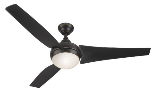 The Harbor Breeze Belleisle Bay ceiling fans in question have a brushed nickel housing finish (model number 40650) or an oil-rubbed bronze housing finish (model number 40651). The design for both models features three matte black blades, a frosted, cased white glass bowl light, and a three-speed reversible motor. They came with remote controls.