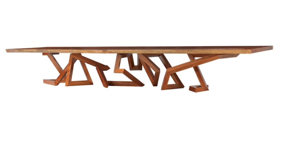 After Brad Pitt commissioned a custom desk from furniture maker Frank Pollaro in 2008, the actor turned his passion for fine furniture into a full-on collection with Pollaro by his side. The Pitt-Pollaro collection debuted in 2012, with each piece—including this unique wooden table—designed by Pitt and built by Pollaro. Their pieces are custom-made, so they are limited, but the duo takes custom requests online.