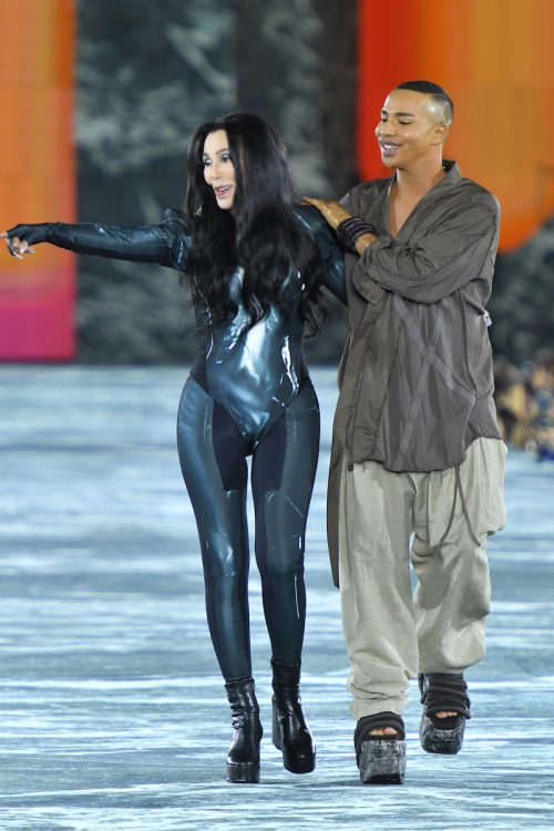 Cher is no stranger to extravagant fashion, so her runway ensemble for the show was almost tame by her standards. She wore a bodysuit with shoulder pads paired with leggings, both of which were printed with a marble-like design. The look was paired with platform boots. As reported by Women’s Wear Daily, Cher walked out to her song “Strong Enough,” and joined Rousteing on the runway. The two embraced before walking off together to cheers from the crowd.