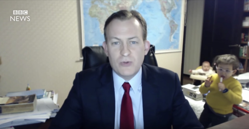 Robert Kelly, a political science professor and expert on Korean relations, often gives interviews from his apartment in Busan. When he does so, he typically locks the door to his study to keep out any unwanted commotion from his two young children. During one interview with the BBC, however, Kelly forgot to bar the hatch and—while the very serious-looking man discusses South Korean politics—they come bursting into the room, trying to get their father’s attention. Kelly, however, remains facing towards the camera, stone-faced, apologizing for the commotion. Soon thereafter, his wife comes running heroically into the background, snatching away the young ones just as Kelly begins to break a smile.