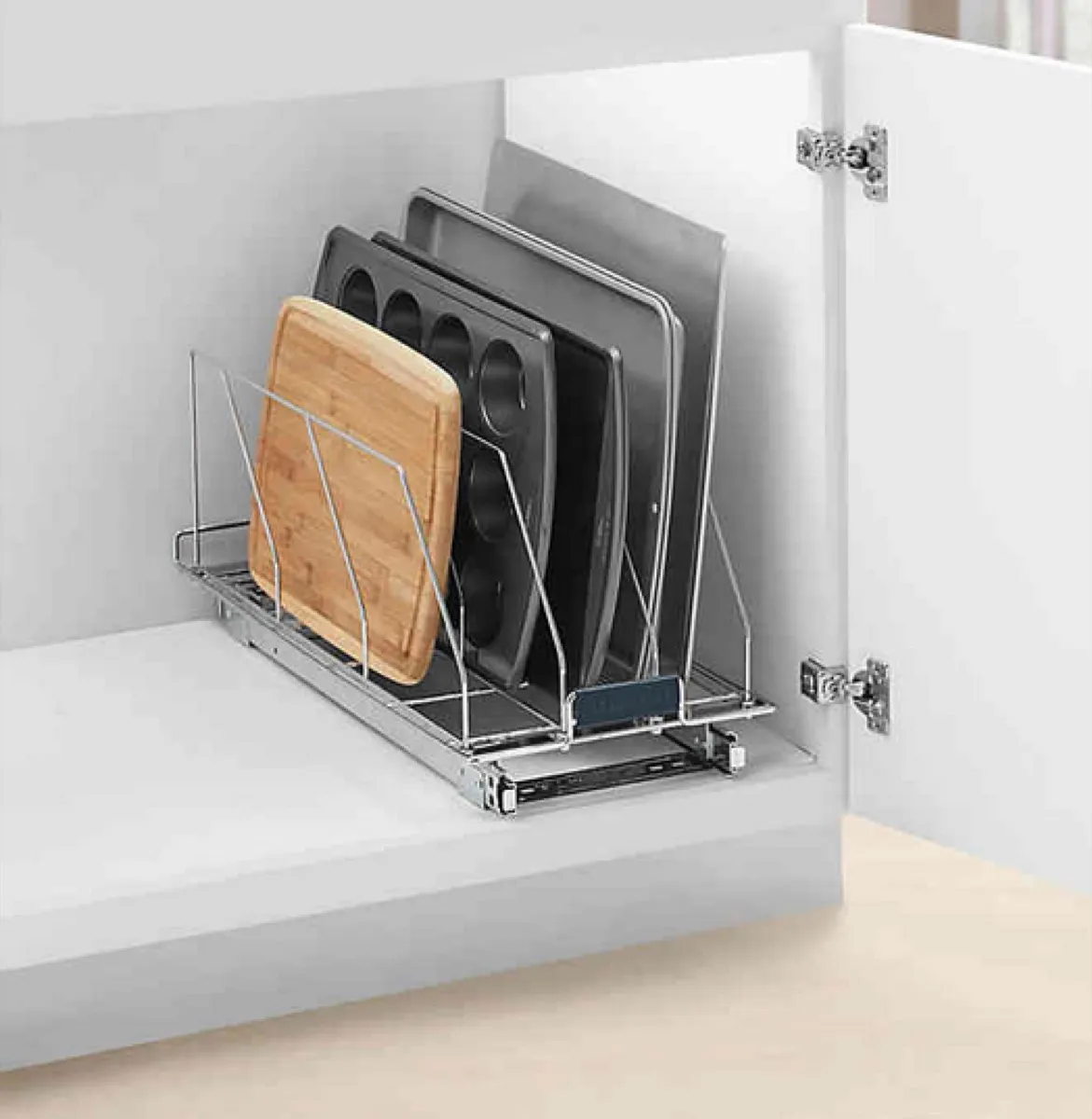This space-saving pullout rack for your bakeware, cutting boards, and serving platters is nothing short of brilliant. It features heavy-duty dividers and easy-slide rails for easy selection—a major improvement on shoving all of them in the broiler drawer under the oven (don’t worry, we do it, too).
