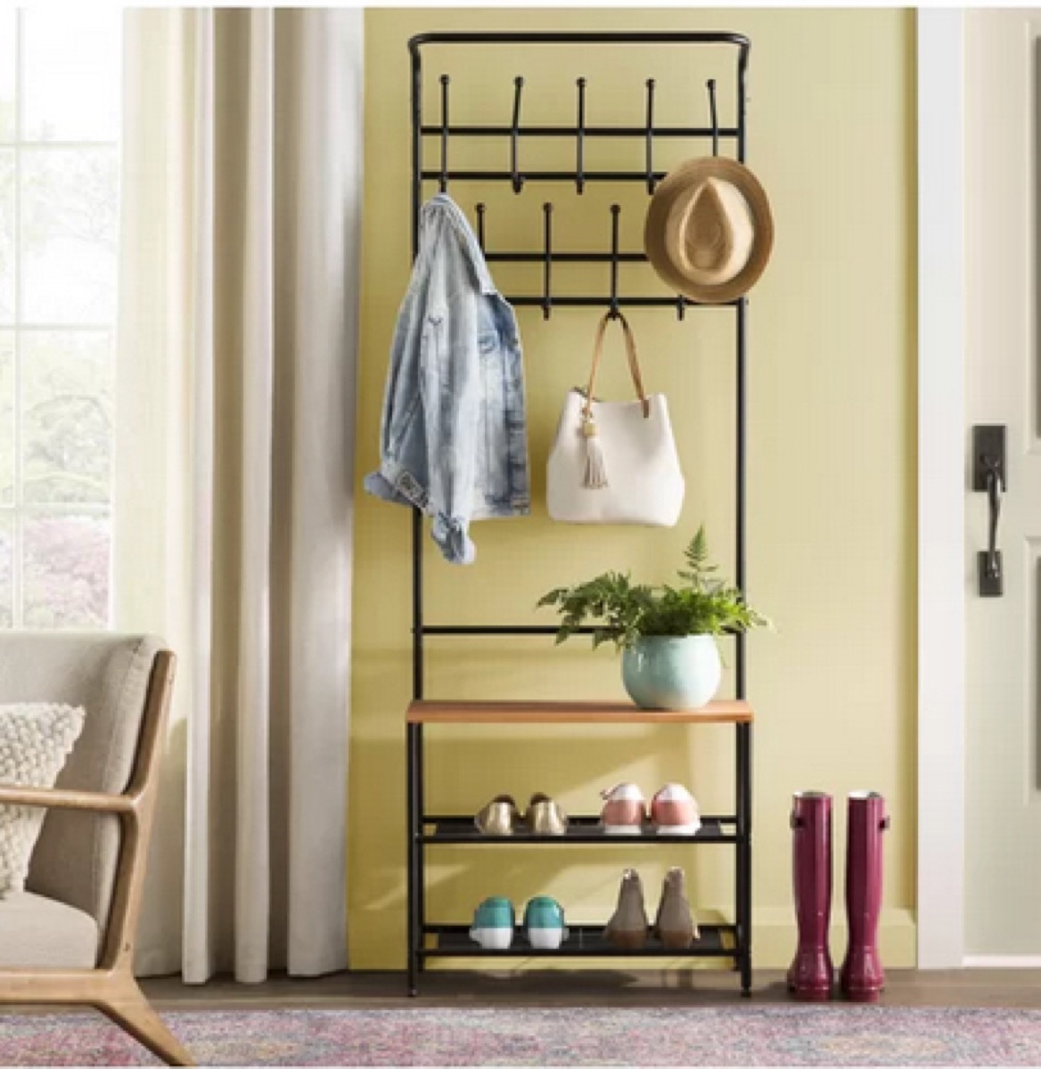 They say that home is knowing where to hang your hat, but what about your jacket, bag, and shoes? This useful entryway storage bench answers all of those questions. It features a double layer of coat hooks, two wire shoe shelves, and a wooden storage bench for plants, backpacks, or the dog’s leash.