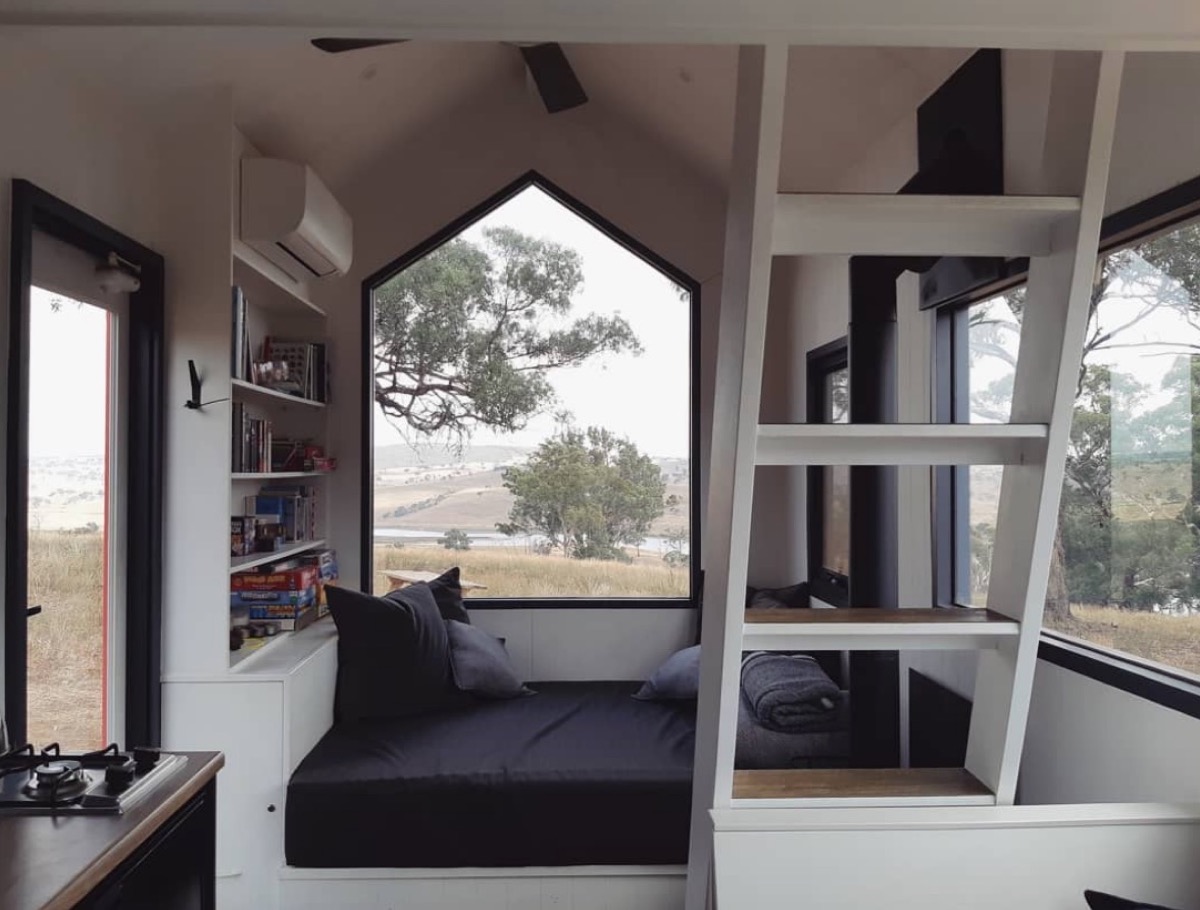 Small square footage doesn’t have to mean a cramped feel, as evidenced by this light-filled home in Oberton, New South Wales. It’s outfitted with enormous windows, a loft bed, and both a mini-split and ceiling fan for those hot Australian summers.