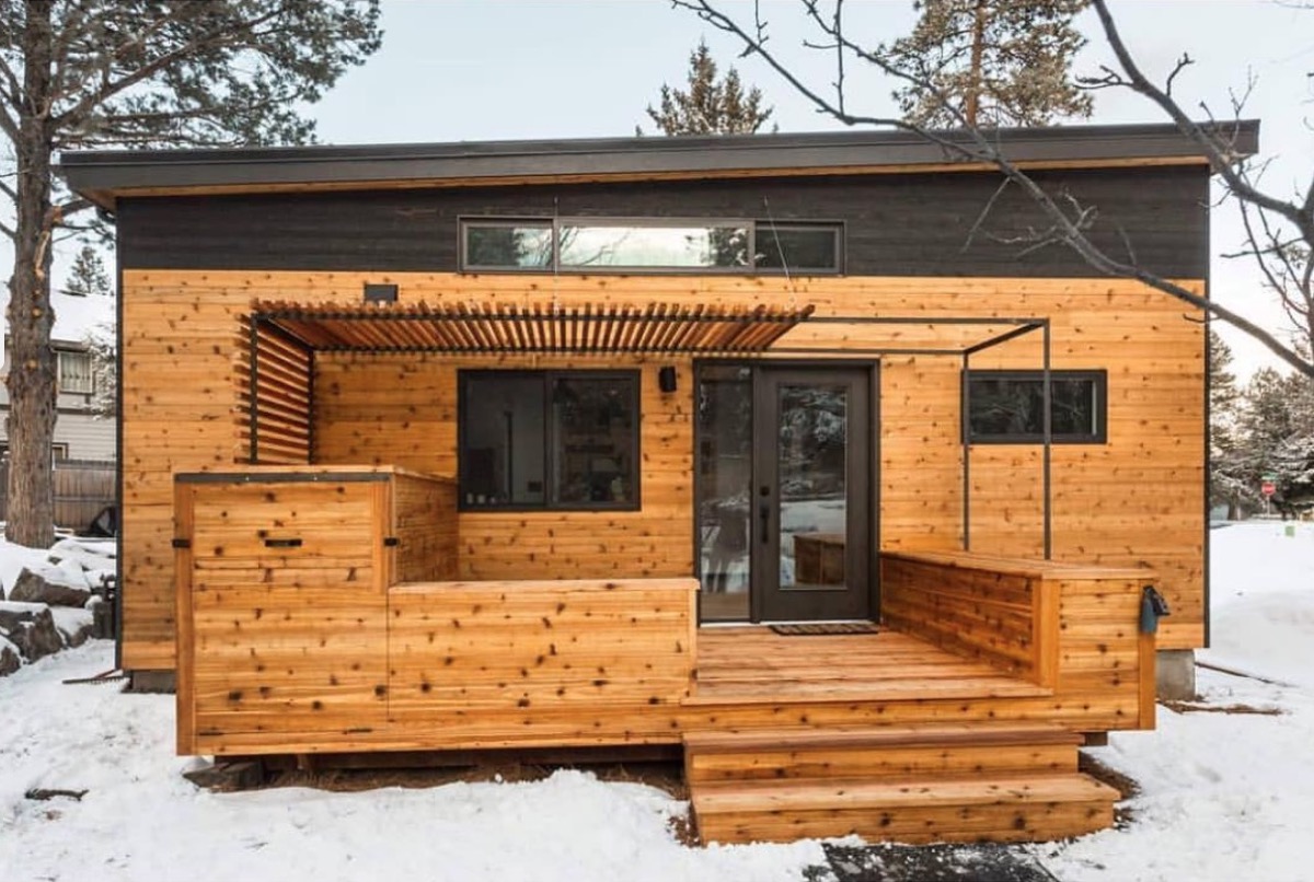 Snow? What snow? This Alaskan wooden tiny house feels springlike all year round, thanks to the addition of window planters and a front porch.