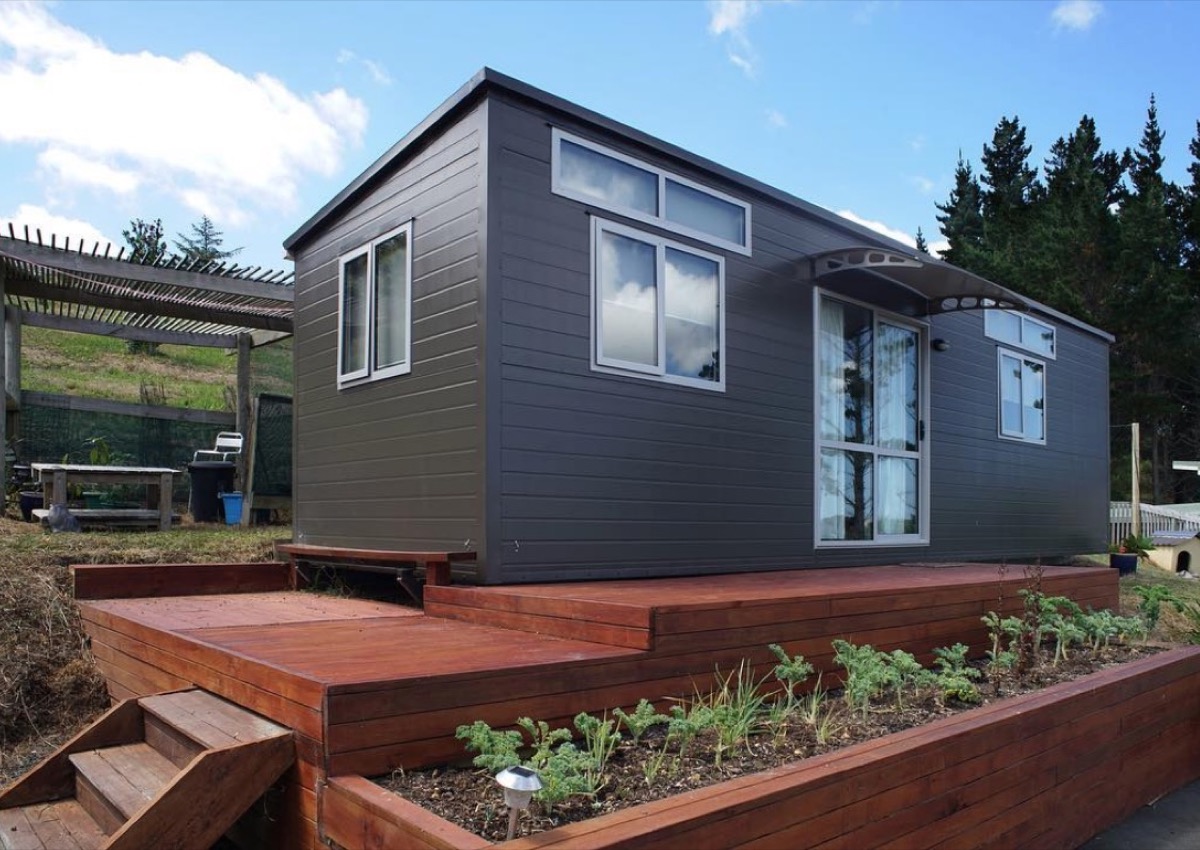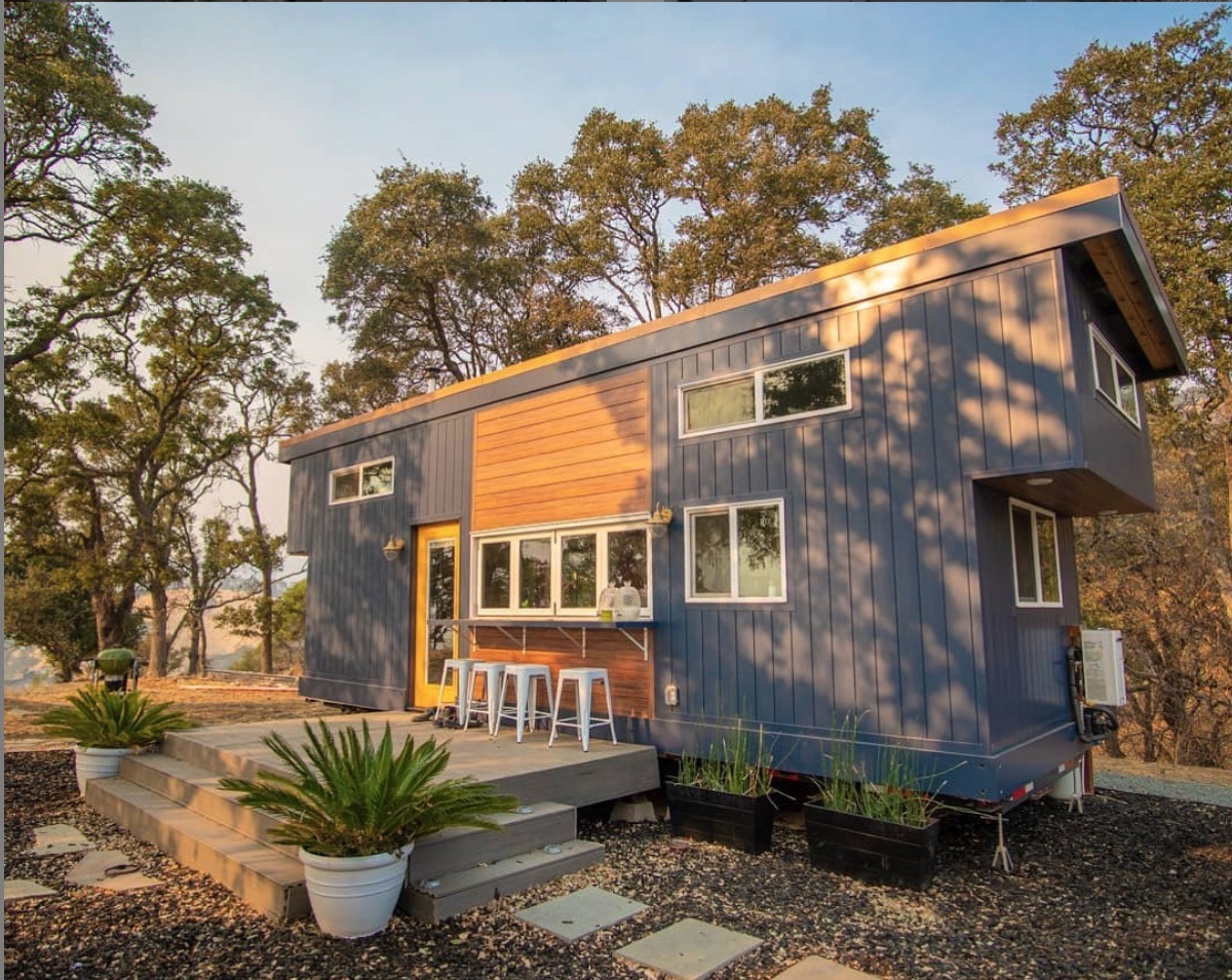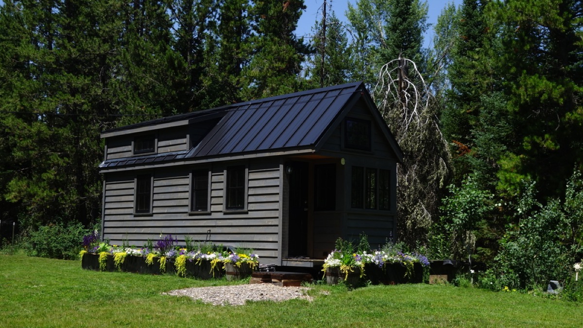 There’s nothing like a few plants to make the exterior of this off-the-grid gray tiny house feel bright and cheery.