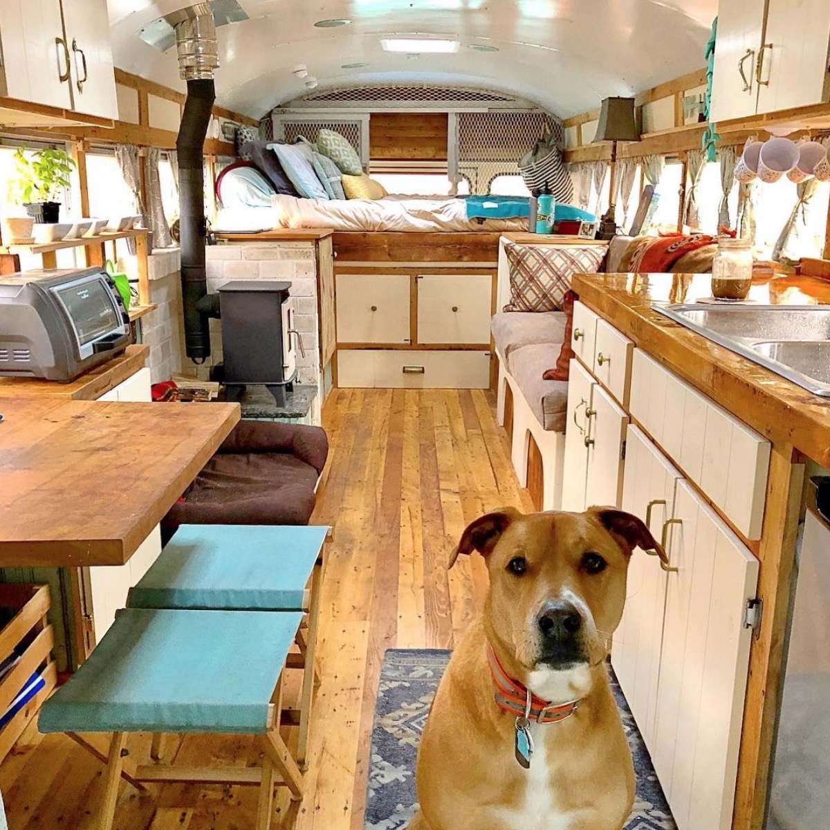 This reimagined school bus bears no traces of its former life, instead creating a cozy home complete with a wood stove, captain’s bed, reading nook, dining area, and plenty of space for its happy canine inhabitant to roam.