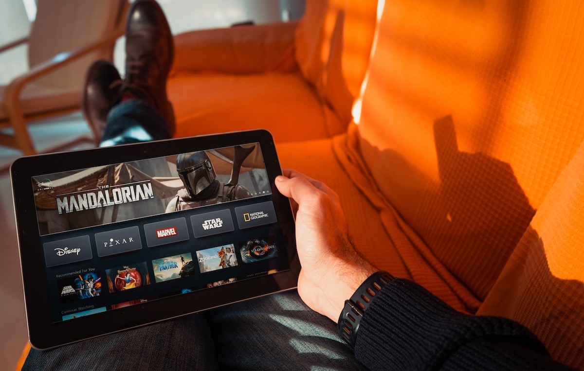 closeup of a person laying on an orange couch using the Disney+ app on their tablet
