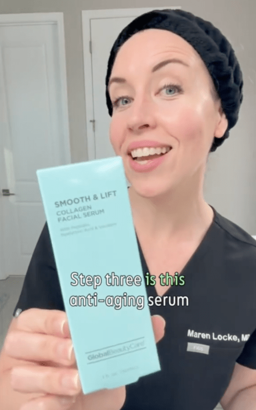 Third in her anti-aging skincare routine is the Smooth & Lift Collagen Facial Serum from Global Beauty Care.