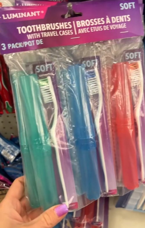 “You can’t even beat their travel-sized toothbrushes,” said Houser. For $1.25, the pack comes with three different colored toothbrushes (very important when traveling as a family!) and corresponding travel cases.