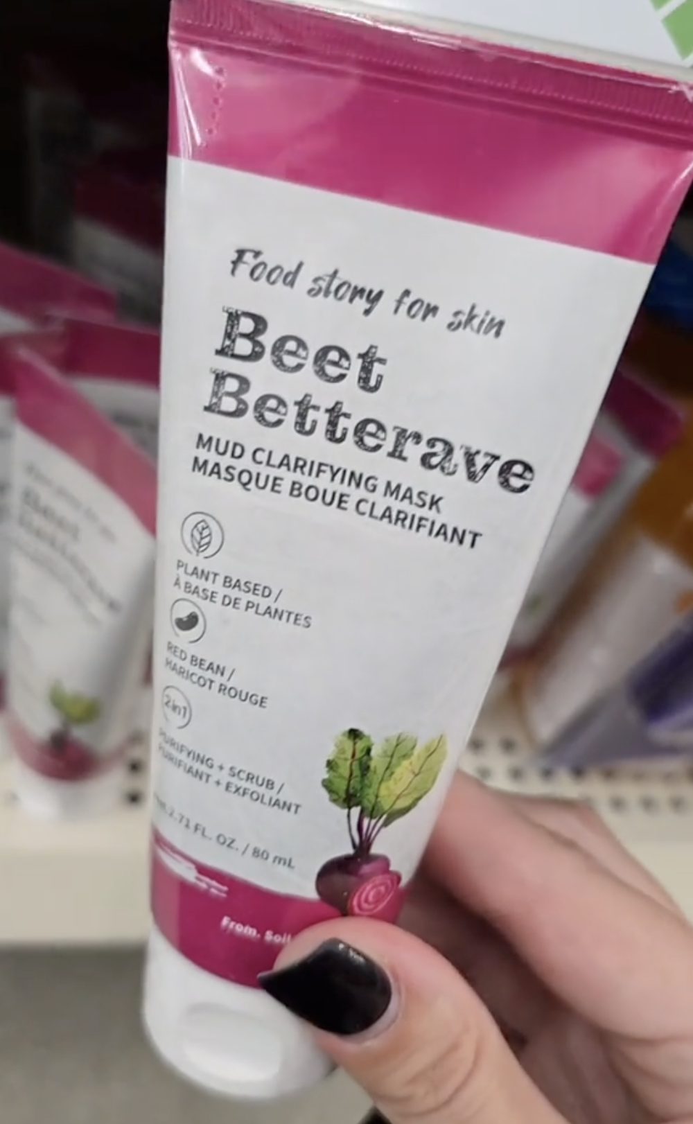 Another new face mask that Schmutz found at Dollar Tree is this clay version made from red bean and beet extracts. The plant-based product also serves as an exfoliator.