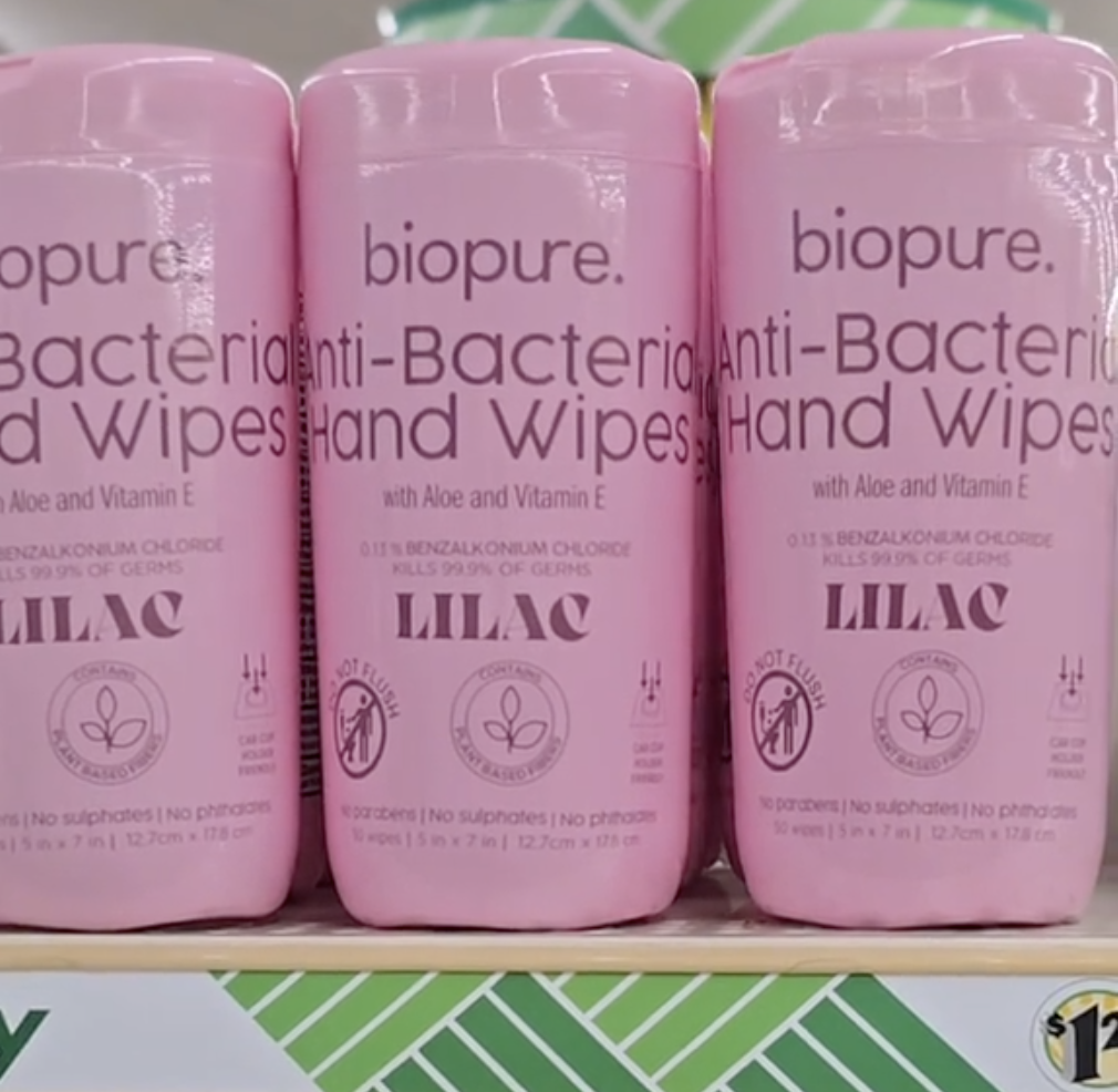 “Biopure has some new antibacterial hand wipes,” Schmutz said of this lilac-scented product, adding, “Love the pink packaging.”