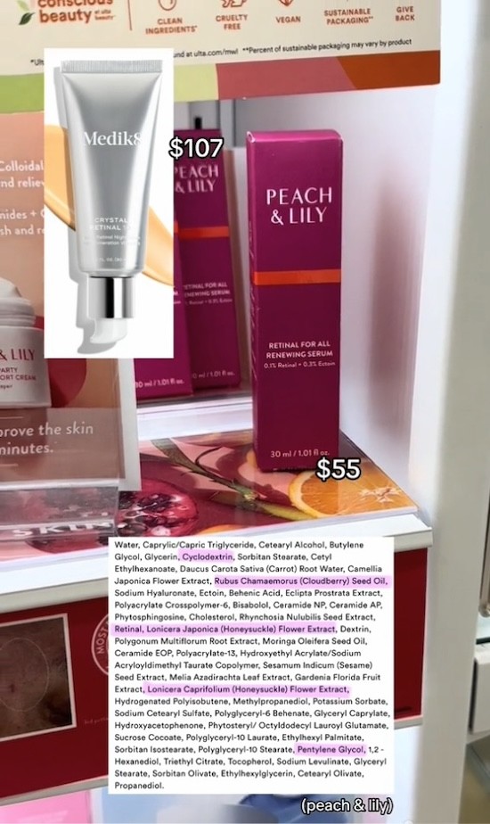 “Medik8 has different strengths for its retinal,” Babula first explained. “The 0.1 percent is going to cost $107, [but] instead you can get 0.1% retinal in that same exact delivery system for only $55 from Peach & Lily.”