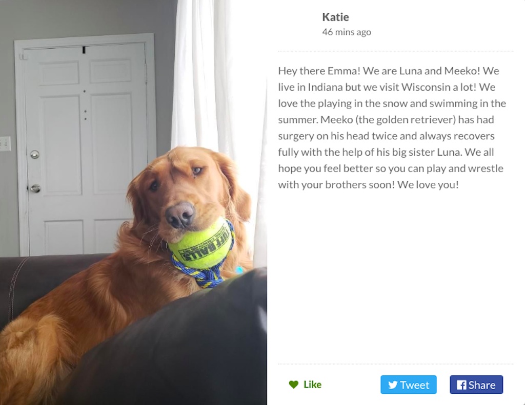 “Hey there Emma! We are Luna and Meeko! We live in Indiana but we visit Wisconsin a lot! We love the playing in the snow and swimming in the summer. Meeko (the golden retriever pictured below) has had surgery on his head twice and always recovers fully with the help of his big sister Luna. We all hope you feel better so you can play and wrestle with your brothers soon! We love you!” these two pups wrote.