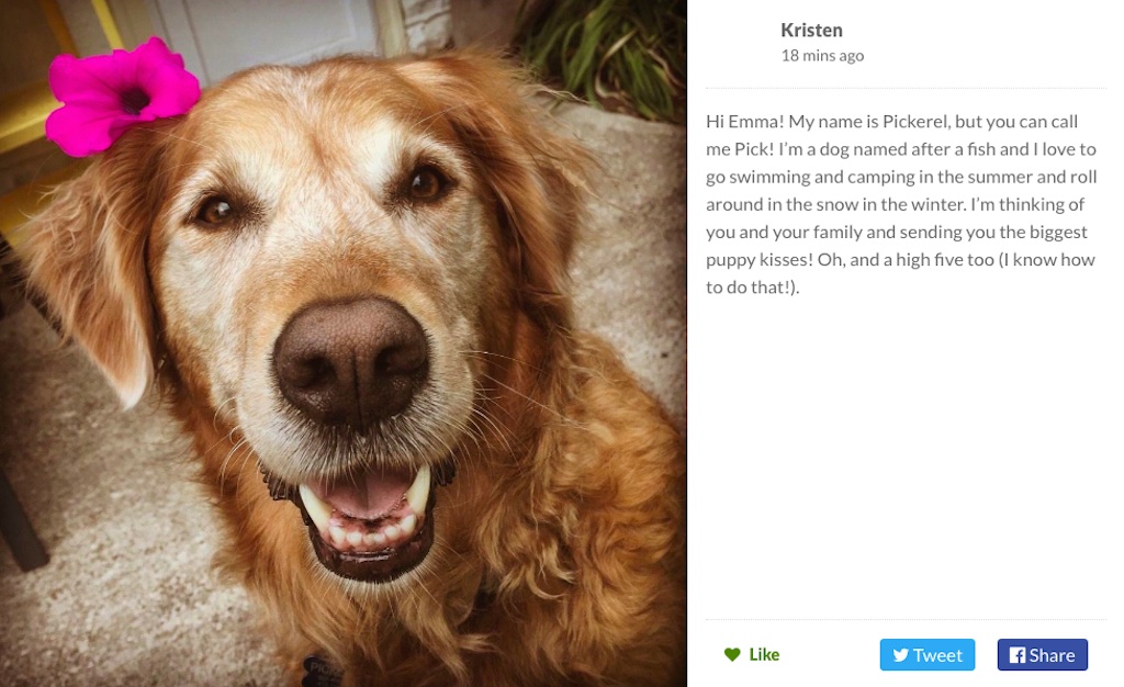 “Hi Emma! My name is Pickerel, but you can call me Pick! I’m a dog named after a fish and I love to go swimming and camping in the summer and roll around in the snow in the winter. I’m thinking of you and your family and sending you the biggest puppy kisses! Oh, and a high five too (I know how to do that!),” this very good boy wrote.