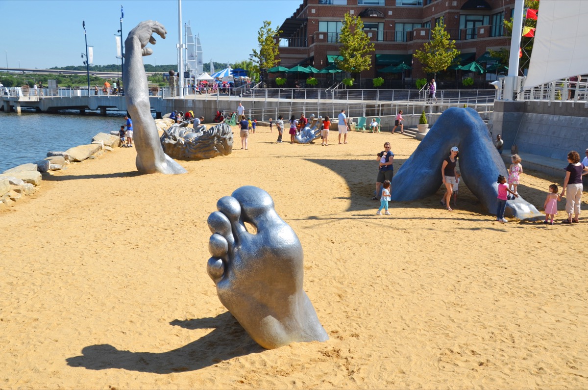 “The Awakening” is a 72-foot aluminum statue of a giant attempting to free himself from the sand.