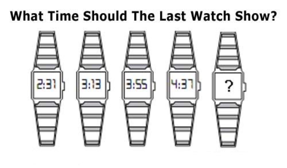 Each watch is 42 minutes ahead of the watch to the left of it. So, 42 minutes after 4:37 would be 5:19. Still hungry for more brain games? Keep the fun going with these 50 Amazing Riddles Only Geniuses Can Solve.