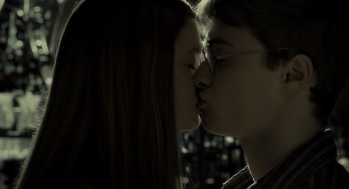 The two friends kiss while hiding the seemingly cursed Potions textbook in the Room of Requirement.