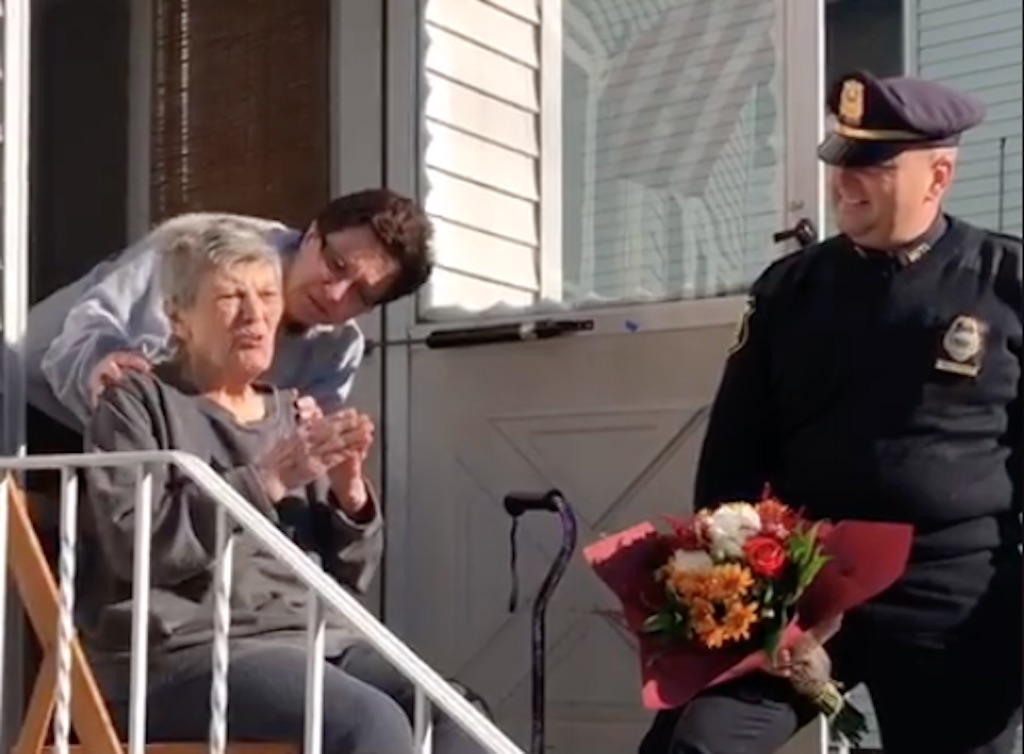 The department decided to return the favor this year by surprising her at her home, offering her a bouquet of flowers and a trophy with her name on it to express their gratitude. And the viral video of the moment couldn’t be sweeter, as Manganiello was clearly caught off-guard but delighted to be greeted by Chief Jack Buckley, while receiving a round of applause from the entire police department.