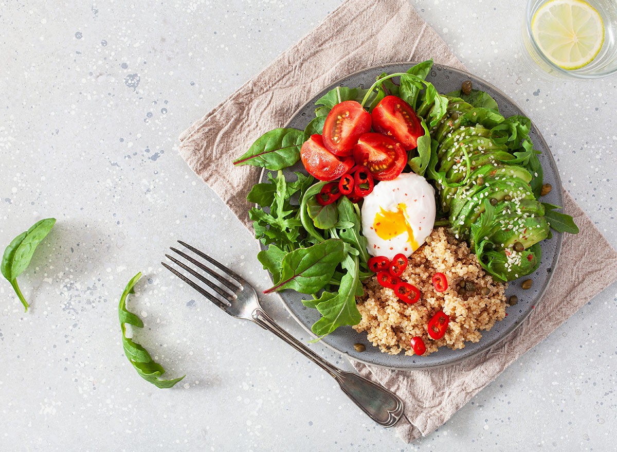 Quinoa can be added to breakfast bowls for a delicious savory meal. “Quinoa is one of the few plant foods that contain all nine essential amino acids,” Beth Czerwony, RD, LD, tells the Cleveland Clinic. “Most complete proteins are meat, so eating quinoa helps you get your protein without the possible health risks of meat. It’s a great protein option for vegans and vegetarians — and omnivores, too.”