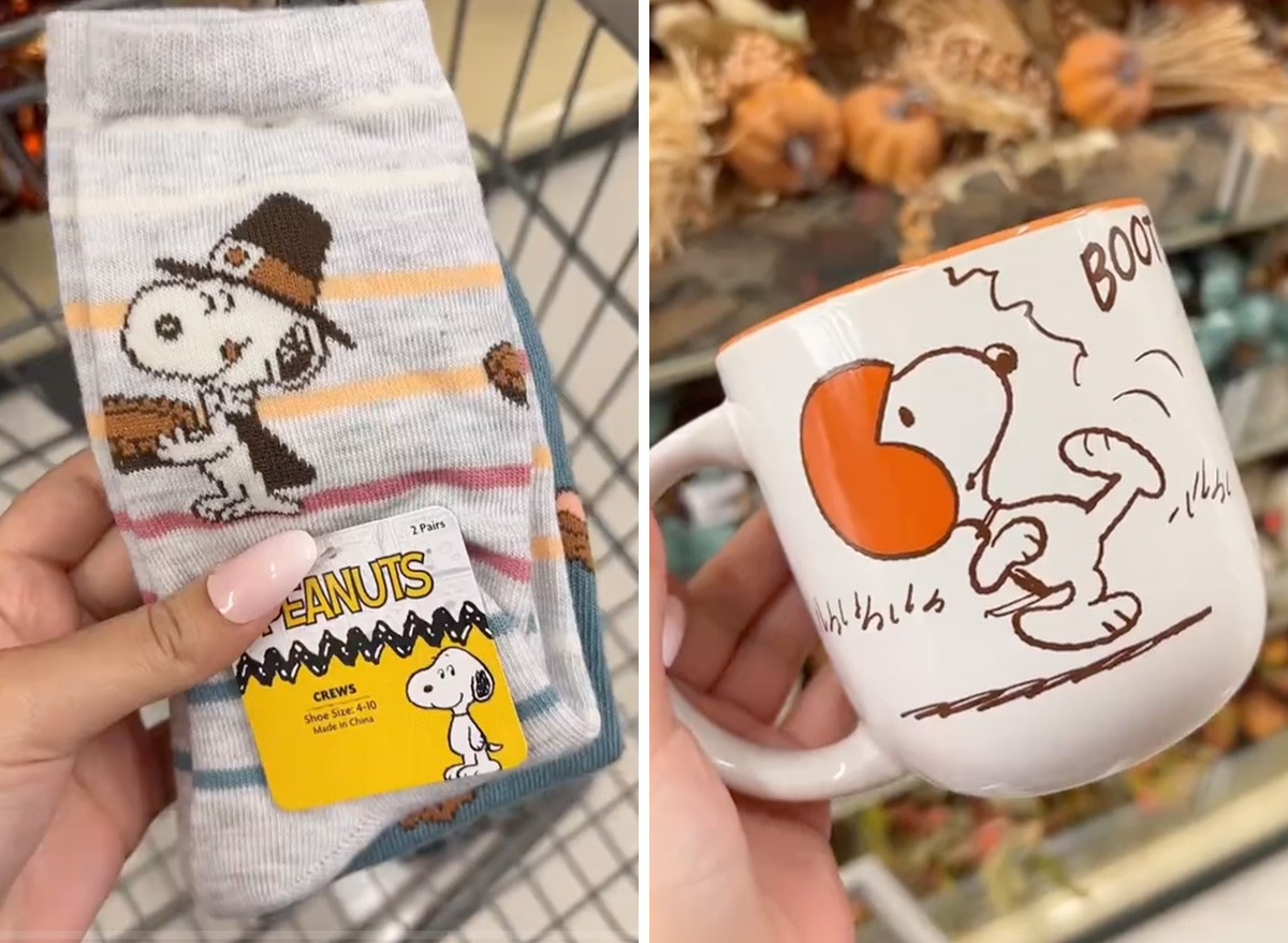 In a recent video, TikTok user @taylorrr08 focuses on Peanuts-themed products you can pick up for autumn. They include a variety of mugs, Snoopy socks, a stuffed Woodstock, serving trays, garden flags, doormats, and more.