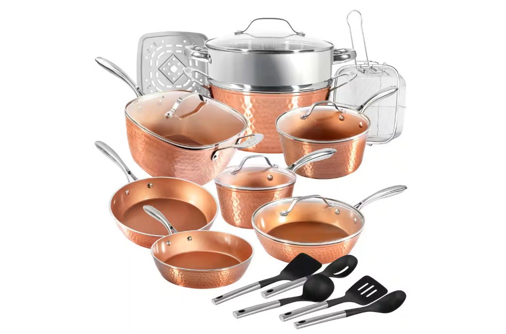 Home Depot is offering this Gotham Steel Hammered Copper 20-Piece Aluminum Non-Stick Cookware Set with Utensils for just $199.99, down from $249.99. “Complete kitchen in a box – includes everything you need to completely outfit your kitchen and take cooking to the next level, includes a full cookware set with frying pans, skillets, saucepans, stock pots with tempered glass lids, a deep frying and casserole pan with a steamer tray, fry basket and lid!” the chain says.