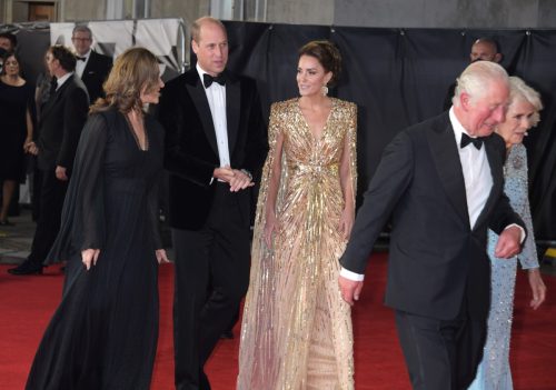 At the No Time to Die premiere, Kate’s gown was the talk of the event. The duchess continued her trend of paying homage to her husband’s mother, the late Princess Diana, with her gold Jenny Packham gown with a trailing cape and cinched detail at the waist. The dress was similar to one Princess Diana wore to the 1985 premiere of another James Bond film, A View to Kill—a shimmering silver Bruce Oldfield gown with a similar waist and shoulder structure.