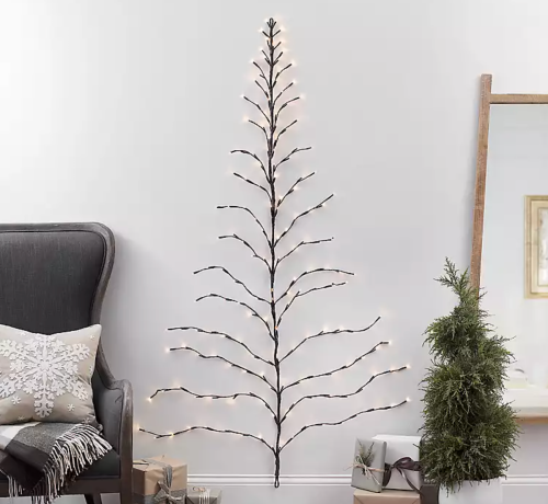This ready-to-mount Twig Christmas Tree ($90) comes with 180 warm white LED lights and a 10-foot cord, giving you endless options for displaying. It measures six feet tall and rolls up for easy storage.