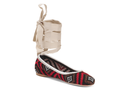I was stunned to see this pair of jaw-dropping MIU MIU Crochet Design Rhinestone Embellished Ankle Tie Flats on sale. The designer shoes retailed for $900 at high-end stores. Now you can snag the colorful pair for $180.