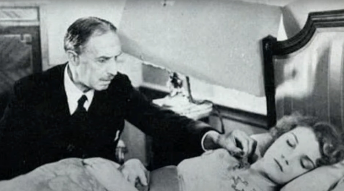 Some have speculated that this odd piece of set dressing was an oversight meant to control glare on the camera lens, but according to Dracula: Dead and Loving It screenwriter and film historian Steve Haberman’s commentary for the classic film’s DVD release, this was a purposeful addition, meant to reflect an allegedly common practice of shielding a patient’s eyes from light while allowing health professionals to work in the room. A fan post on a message board points out that the presence of similar sickroom lamp shields in 1932’s Faithless, 1937’s Nancy Steele Is Missing!, and 1952’s Full House support this assertion.