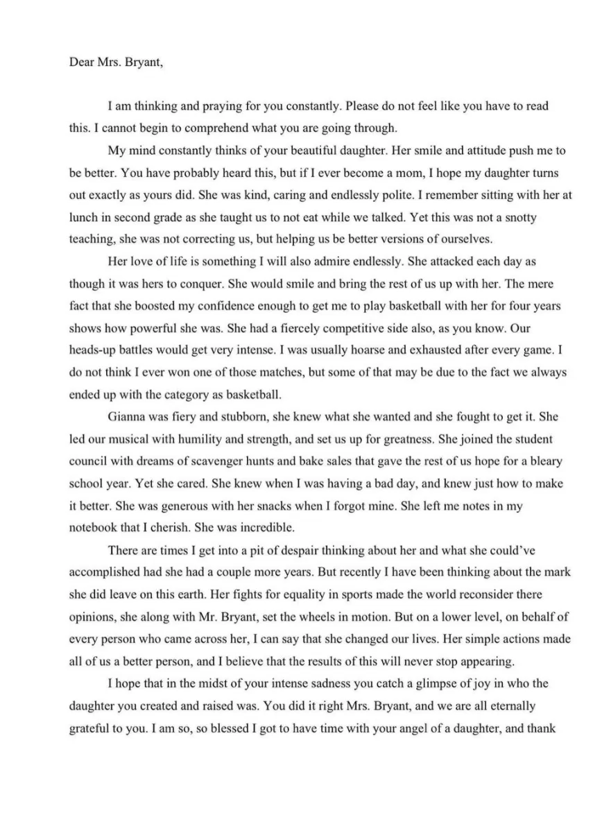 In her letter, Aubrey shared some memories of Gianna with Vanessa. She told her about their time doing musicals and playing basketball together. “The mere fact that she boosted my confidence enough to get me to play basketball with her for four years shows how powerful she was,” Aubrey wrote. She said that Gianna always knew how to make her feel better and “was generous with her snacks when I forgot mine.” She also reflected on Gianna’s passion for equality in sports and the effect she had on those around her.