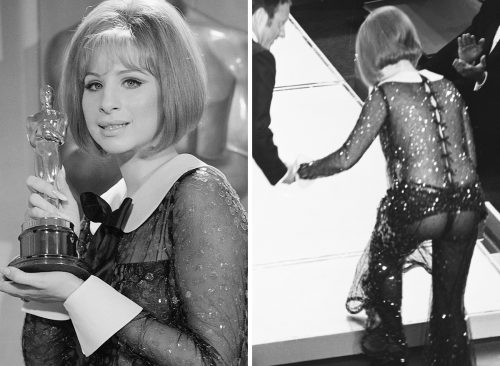 Barbra Streisand wore this sheer suit to the 1969 Oscars without realizing it was sheer, or so she claims. The see-through fabric is a confusing contrast with the demure oversized collar and bow.