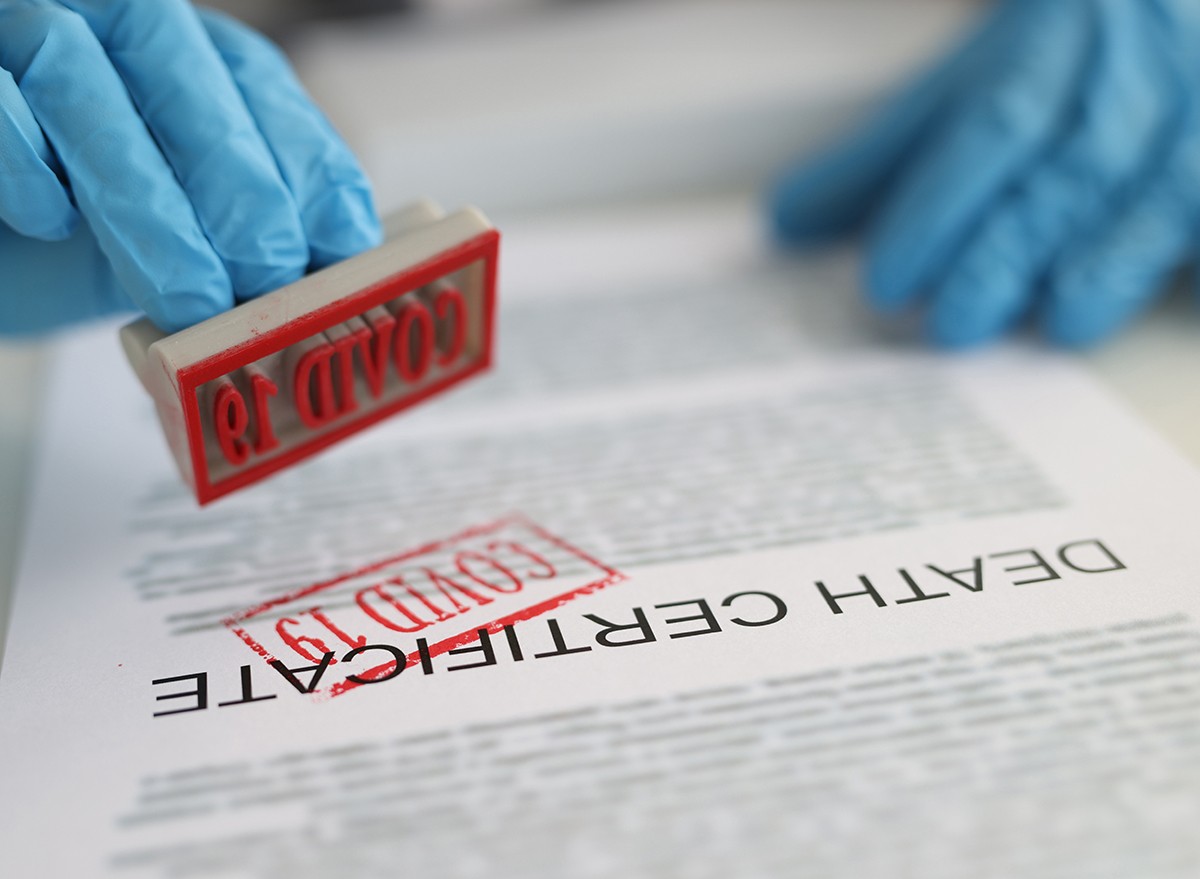 Gloved hands stamp a death certificate with the words, 'Covid 19'