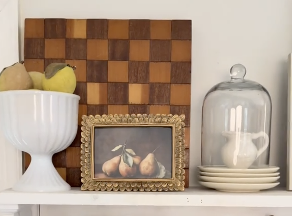 In this case, they spotted an old wooden checkerboard for $3 in the toy aisle at Goodwill. At home, they leaned it on that same kitchen shelf as a country-style cutting board.