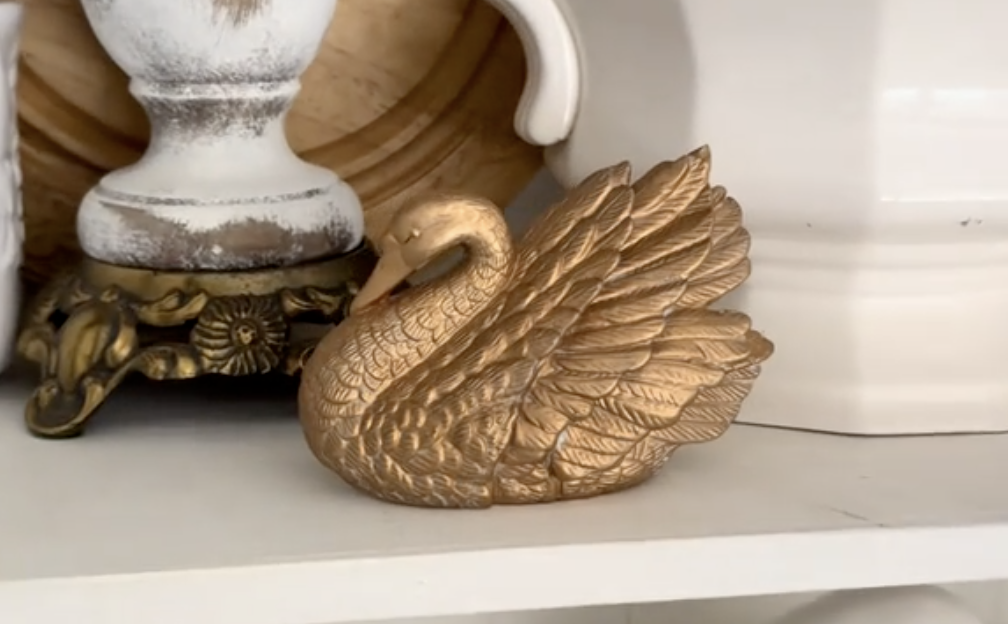 For example, the video shares how they came across a white ceramic swan at Goodwill. It was faded looking and not very stylish, but after a full coat of gold paint, it made a chic addition to a kitchen shelf filled with white crockery and gold accessories.