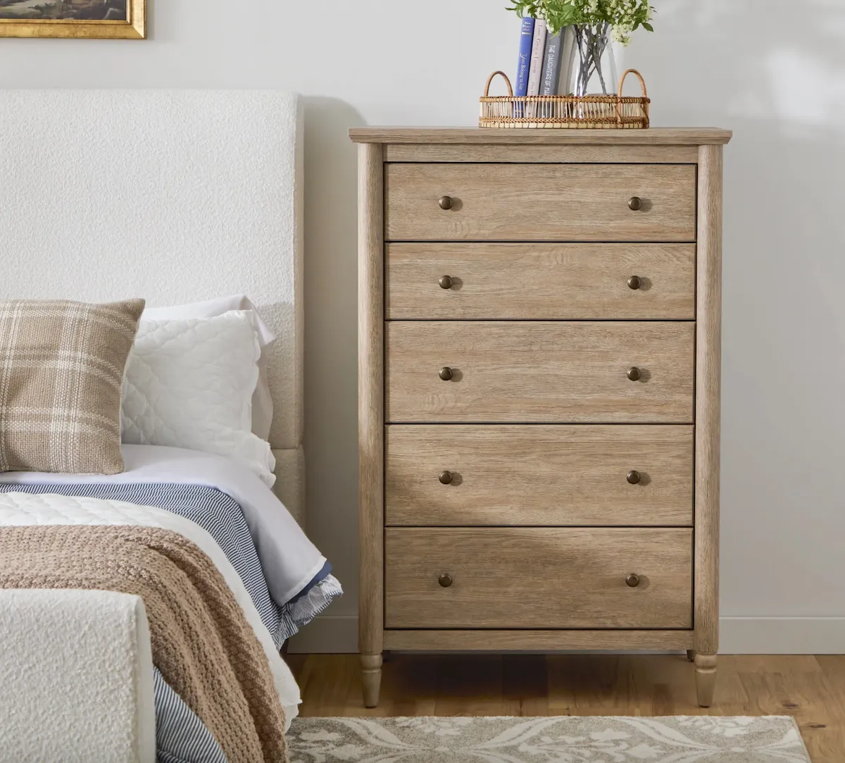 A tall dresser frees up floor space, leaving you more room to decorate (or not, if you’re trying to declutter). Dressers come in a variety of materials and colors, but if a traditional wood finish is more your vibe, Pottery Barn’s tall Sausalito dresser could be right up your alley.