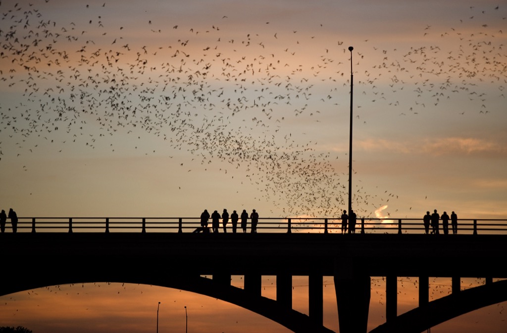 Every June, the enormous colony of Mexican freetail bats (purportedly the largest bat colony in the world) roosting under Austin’s Congress Avenue Bridge gives birth to new bat pups. By mid-August, the pups are finally ready to venture out on their first flight. Onlookers gather at dusk to watch in awe as approximately 1.5 million bats swoop out from under the bridge to begin their evening hunt.