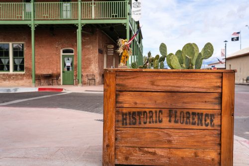 Florence was established in 1866, according to the Chamber of Commerce, but in 1875 it became the Pinal County seat and a silver boom town. Today, nearly the entire town is a National Historic District, with 25 buildings listed on the National Register of Historic Places. Along Main Street, you’ll find old commercial buildings and saloons that are now shops and restaurants. And throughout, you’ll see Sonoran homes, an architectural style that dates back to the 1840s when this area was part of Mexico; they are one-story adobe rowhouses.