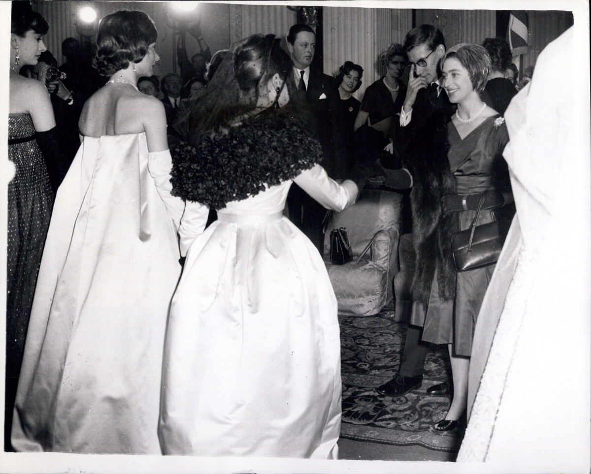 Compared to the tight hourglass dresses that were popular throughout the 1950s, trapeze dresses—flowing, waistless, triangular things—seemed modern by the end of the decade. The 1958 Dior collection, designed by the one and only Yves Saint Laurent, introduced the shape—and here’s Her Royal Highness Princess Margaret taking the ridiculous look in.